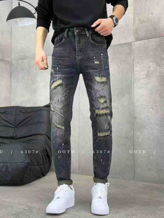 65件设计感潮牌破洞泼墨修身束脚牛仔裤。面料舒适,品...