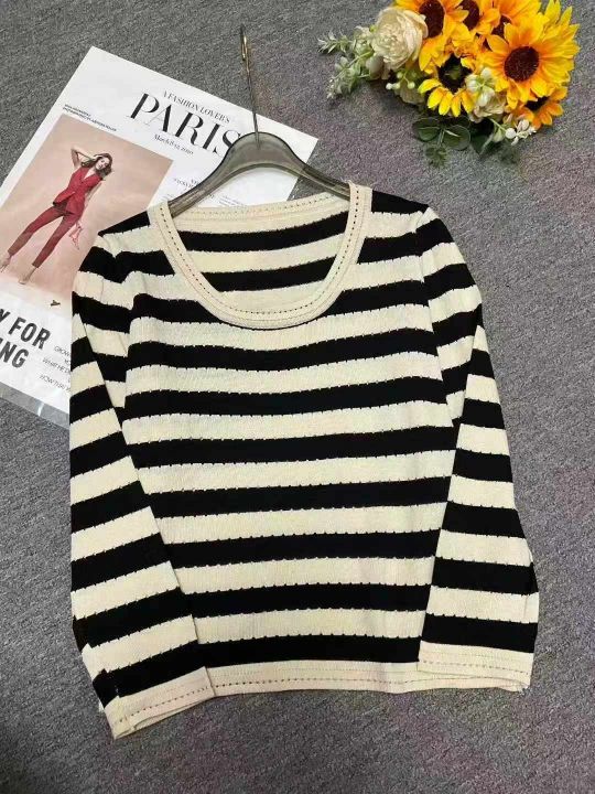 春秋款新品撞色条纹宽松正肩长袖针织衫,独立包装,均...