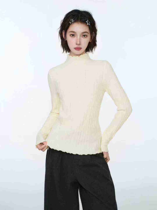 修身百搭半高领木耳边长袖打底衫针织衫,整款两色,手...
