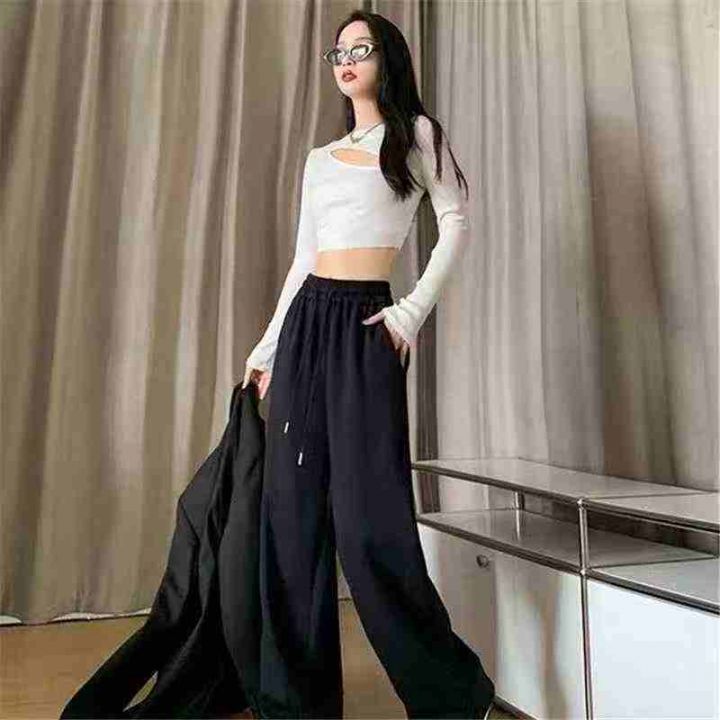 棉质运动裤女新款垂感休闲直筒春秋窄版松紧阔腿裤,数...