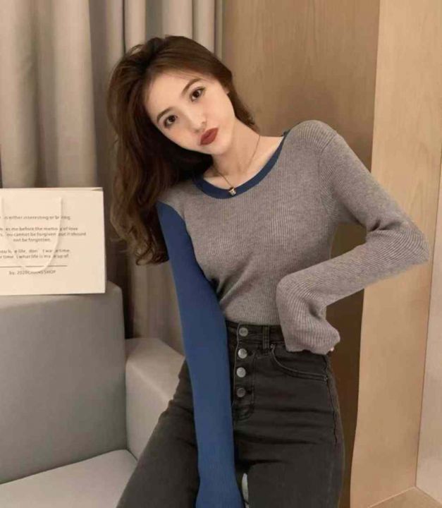 秋冬新款高弹力修身显瘦撞色设计感包芯纱打底长袖针织衫,独立包装,均码面...