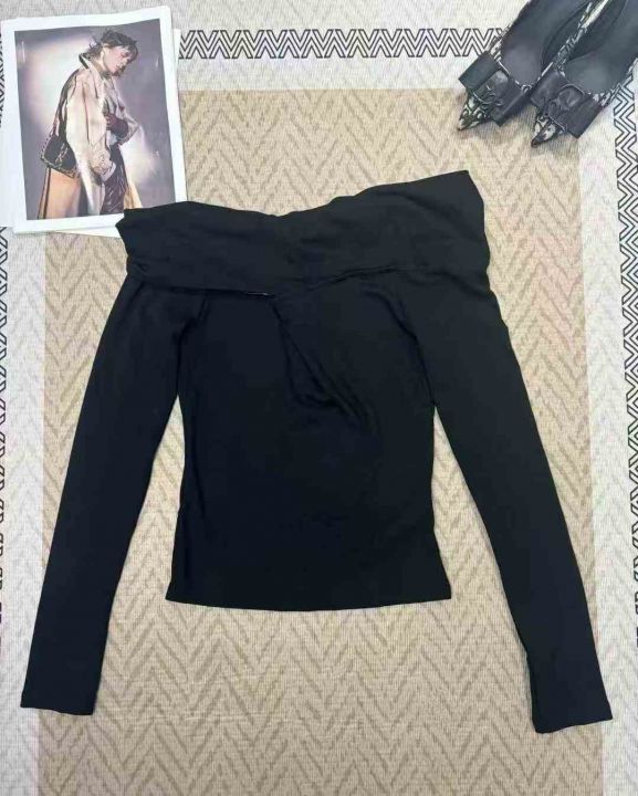 80件左右早秋穿搭一字露肩扭结黑色打底上衣!面料软糯亲肤高弹力,尺码S-L,全清6.5