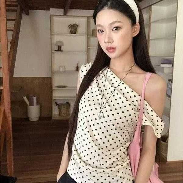 上新全清:7.8一件复古甜美波点斜肩修身辣妹上衣,95件左右,蓝色为主,均...
