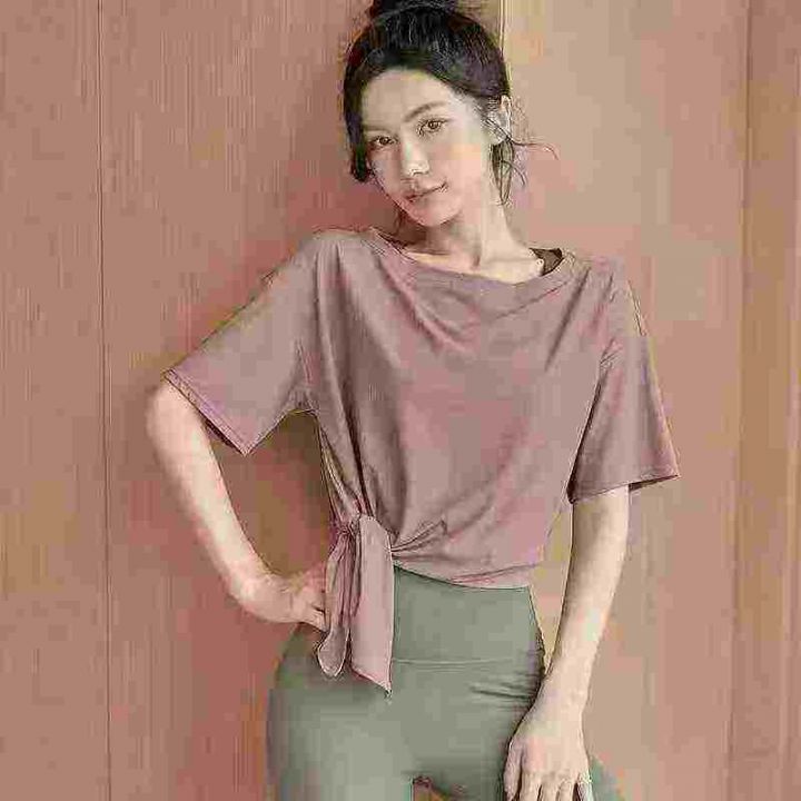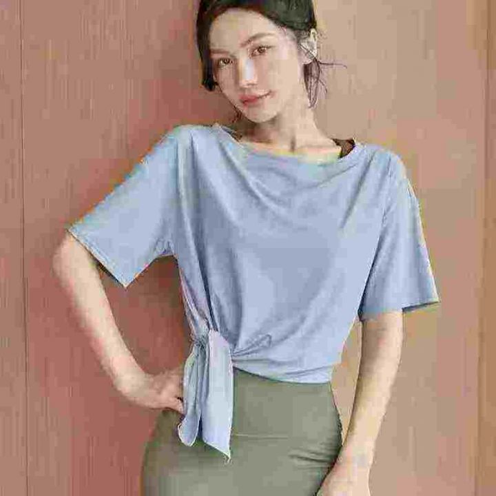 天猫在售款300件左右夏季薄款运动宽松下摆开叉不规则瑜伽服短袖T恤,高弹力,单款三色,S-XL,独立包装带吊牌