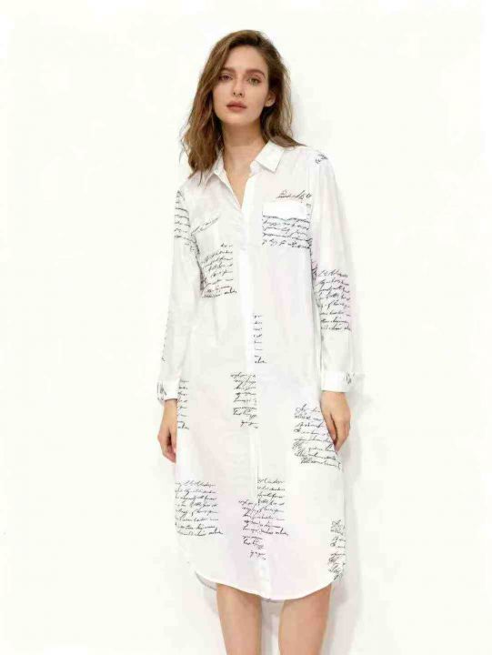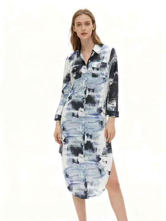 春季新款时尚气质速卖欧美印花纽扣衬衫长袖气质连衣裙...