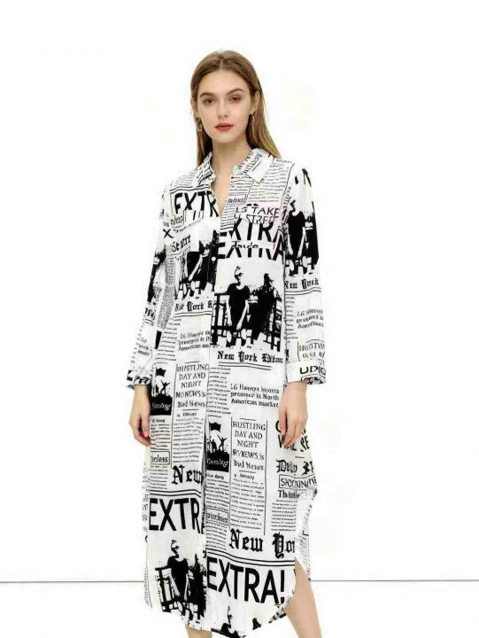 春季新款时尚气质速卖欧美印花纽扣衬衫长袖气质连衣裙,独立拉链包装,S-2XL,520件,全清10.8