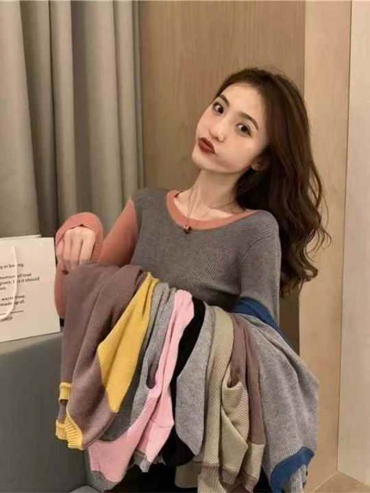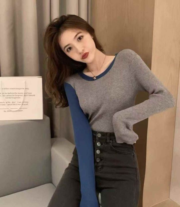 秋冬新款高弹力修身显瘦撞色设计感包芯纱打底长袖针织...