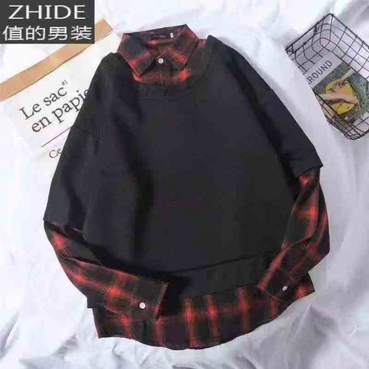 爆款假两件棉质卫衣春秋新款美式复古格子上衣宽松休闲...