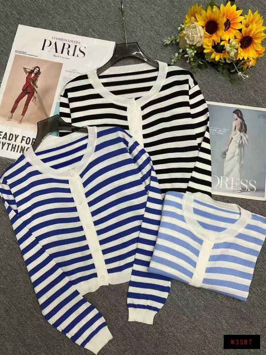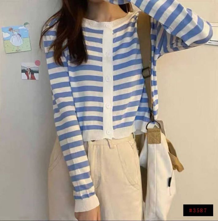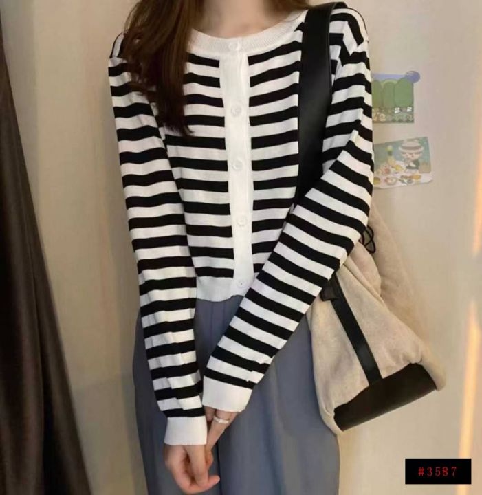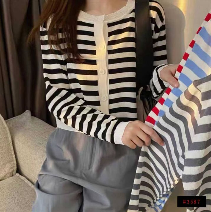 秋季新品撞色条纹百搭短款宽松针织毛衣开衫,独立包装...