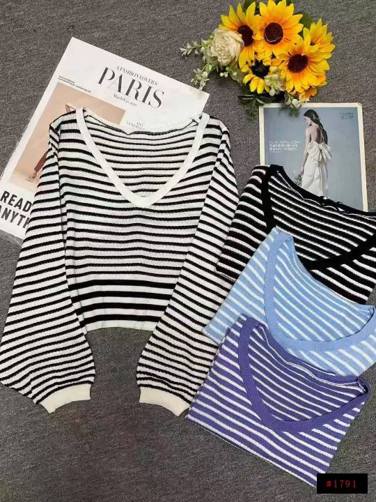 秋季新品撞色条纹宽松慵懒风短款针织V领套头毛衣,独立包装,均码面料柔软...