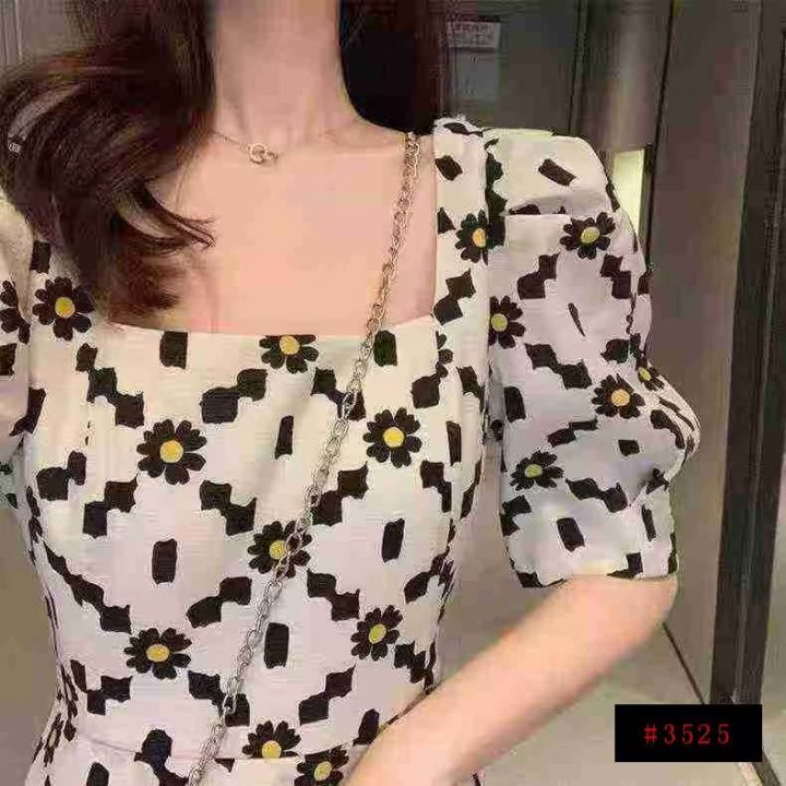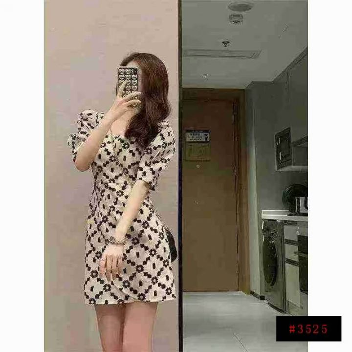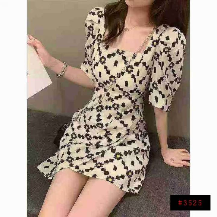 夏季热卖雏菊泡泡袖名媛气质显瘦短袖裙方领设计感连衣裙,独立包装,码数1-5码,数量550条,分货加1,(货号0913#45)@_@