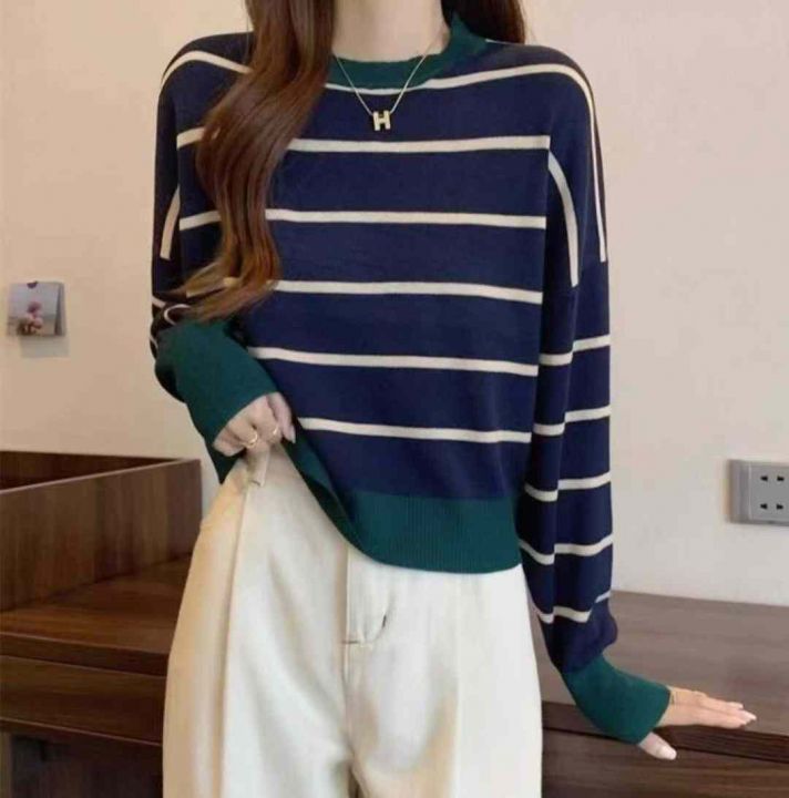 秋季新款短款宽松港味复古慵懒风撞色条纹针织套头毛衣...