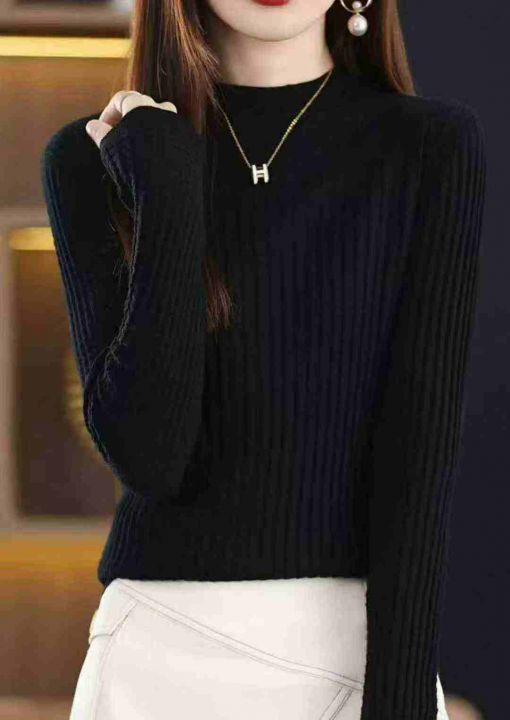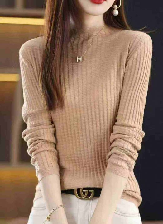 秋冬新款半高领薄款华夫格精纺设计感内搭打底针织衫,...