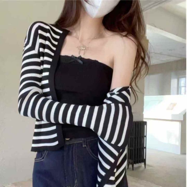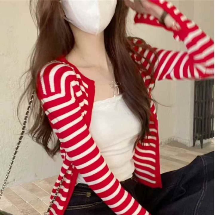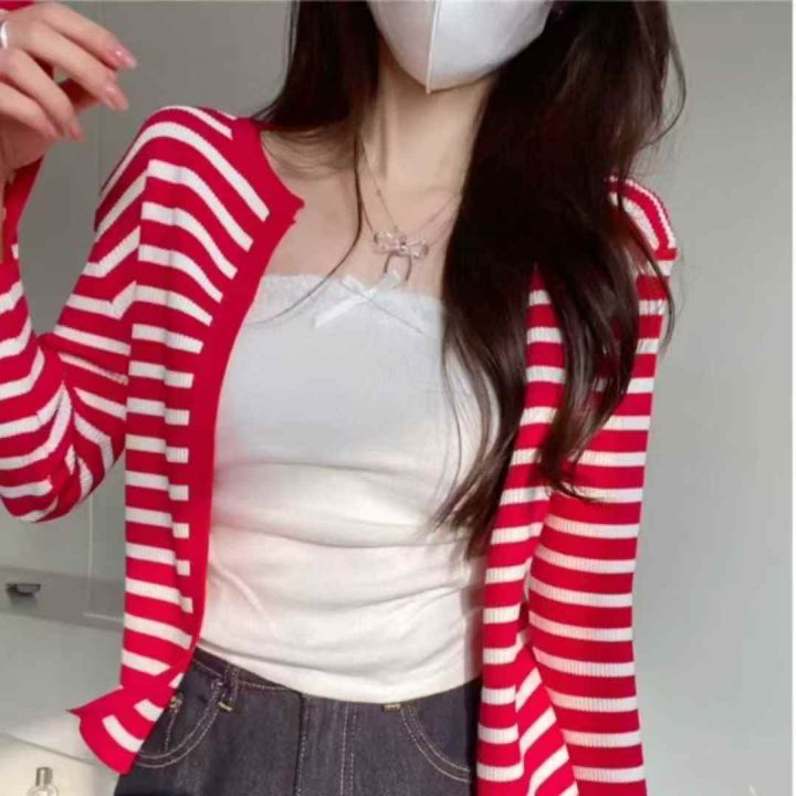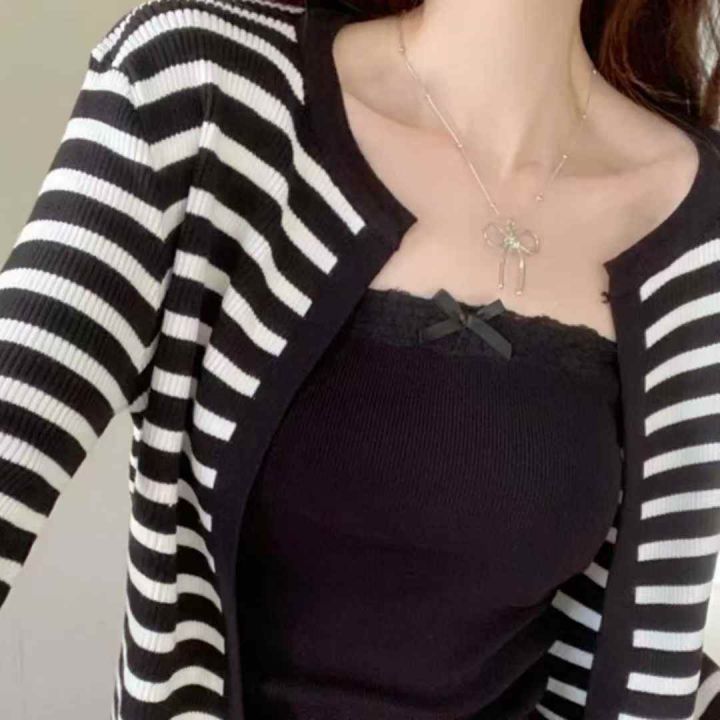 秋季新品撞色条纹包芯纱针织毛衣开衫+针织吊带背心2件...