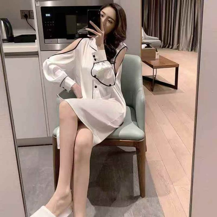 ① 网红冰丝性感露肩韩版宽松家居睡裙!独立包装,整...