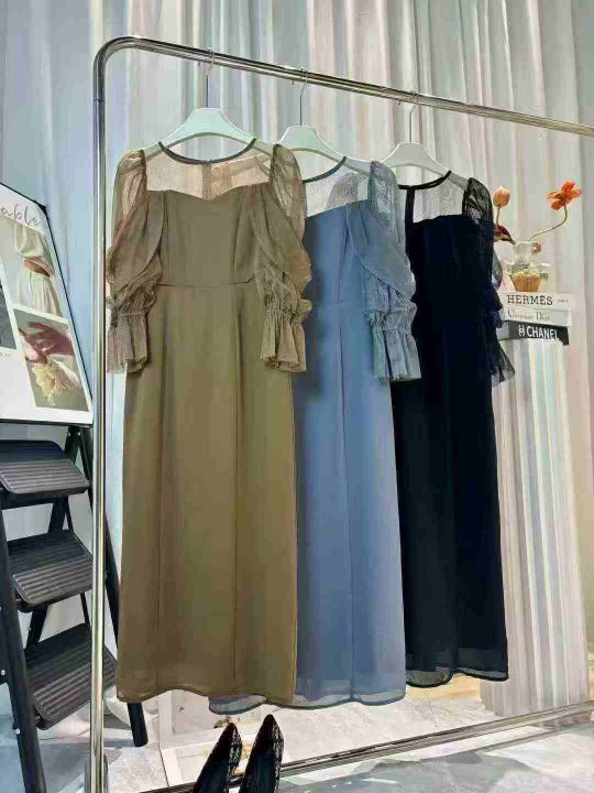 300条日单圆领拼接网纱微透喇叭袖收腰显瘦纯色开衩鱼尾连衣裙,质量超好!琉璃网纱微弹力不易勾丝,有内衬,尺码S-L,独立包装!全清17.8