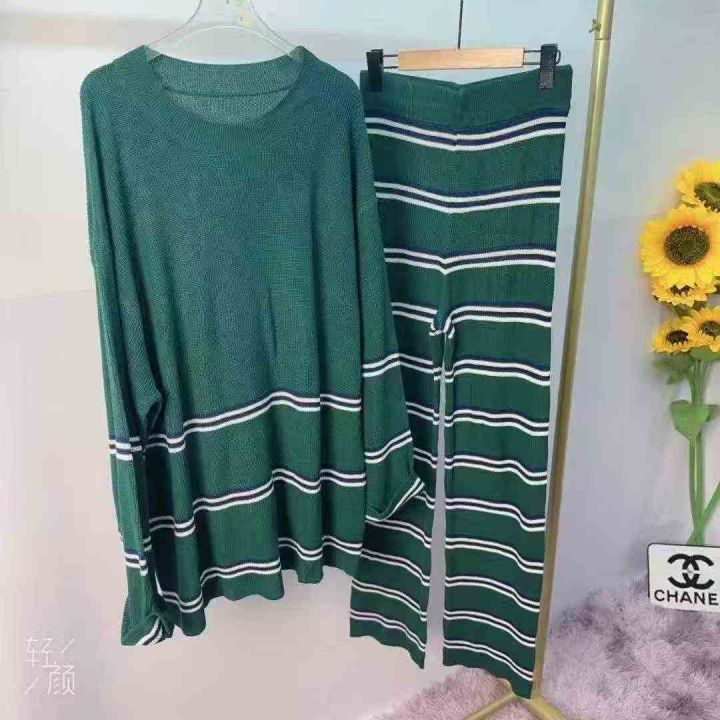 夏季复古慵懒风撞色宽松百搭针织上衣高腰显瘦长裤两件套女,码数S-XL码,面料舒服柔软,独立包装,货品干净,第一个款有57套,条纹有两套.蓝色的有一套.60套全清16.8