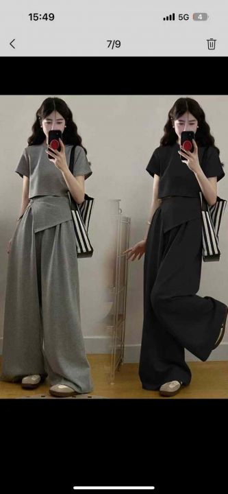 时尚阔腿休闲套装新款设计感洋气减龄显瘦短袖阔腿裤两件套,整款2色,灰色为主,独立包装,货品干净,后领包边,1到4码,3400套左右,12.8清,分货加1。 货号:1323