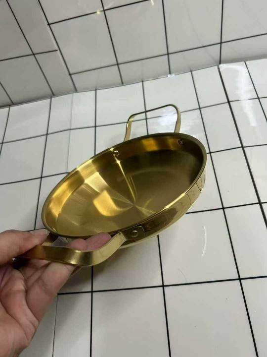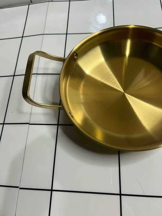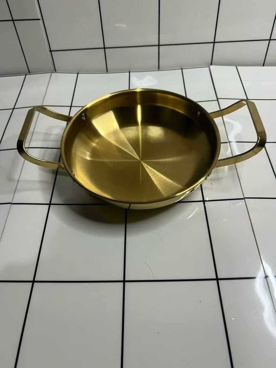 韩式不锈钢干锅海鲜锅,金色平底浅锅菜盘商用双耳锅电...