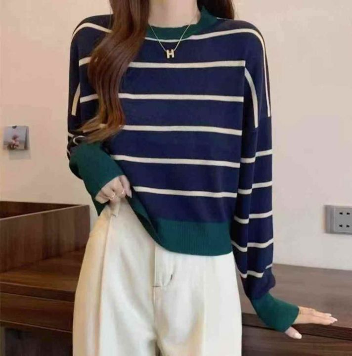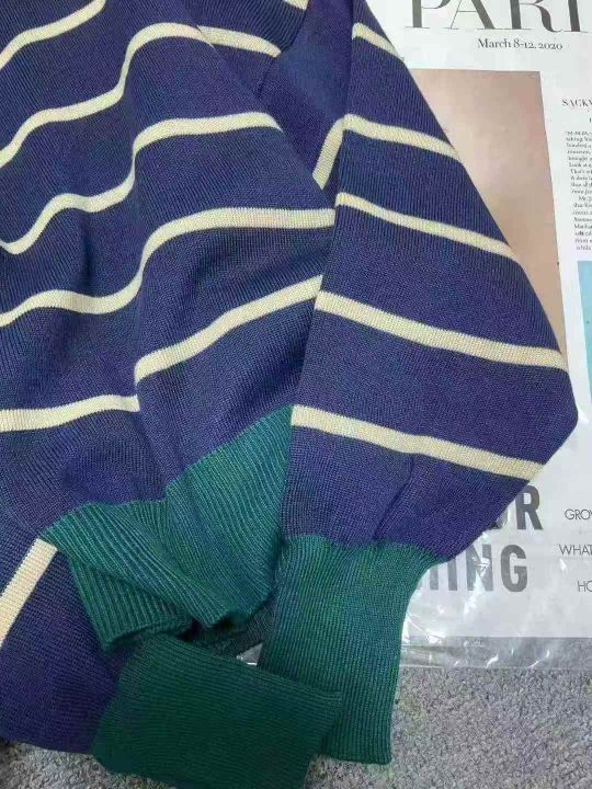 秋季新款短款宽松港味复古慵懒风撞色条纹针织套头毛衣...