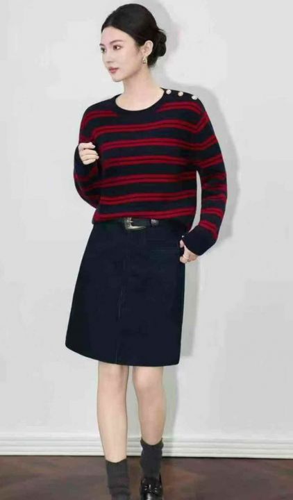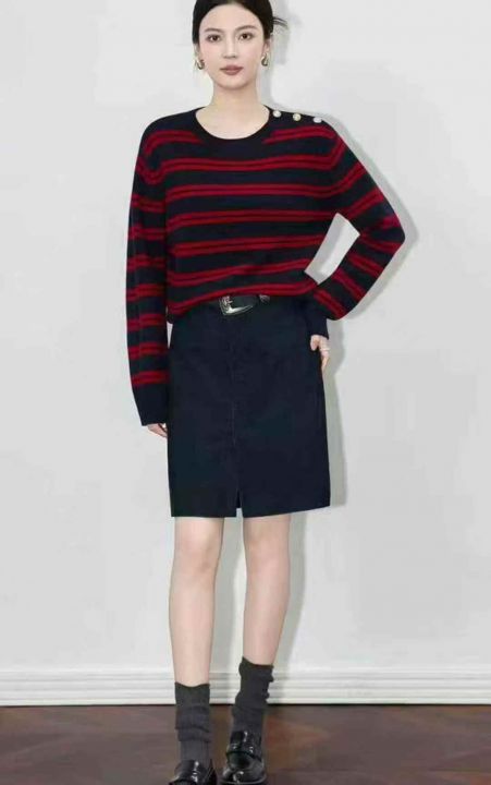 秋季新品设计款撞色条纹圆领套头毛衣,独立包装,均码...