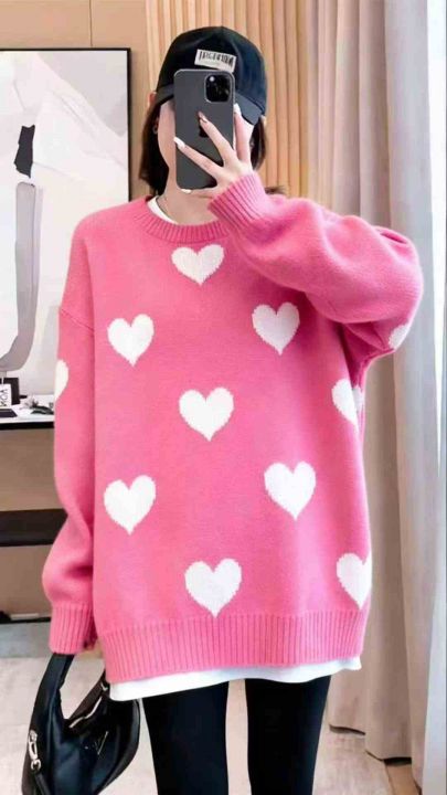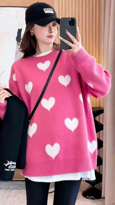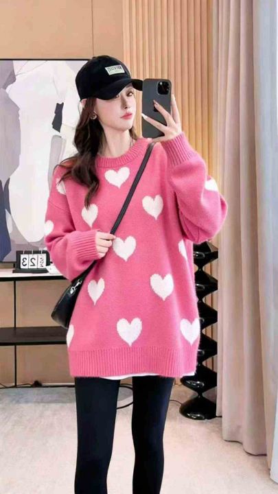 秋冬新款宽松爱心提花中长款遮屁慵懒风北极绒套头毛衣...