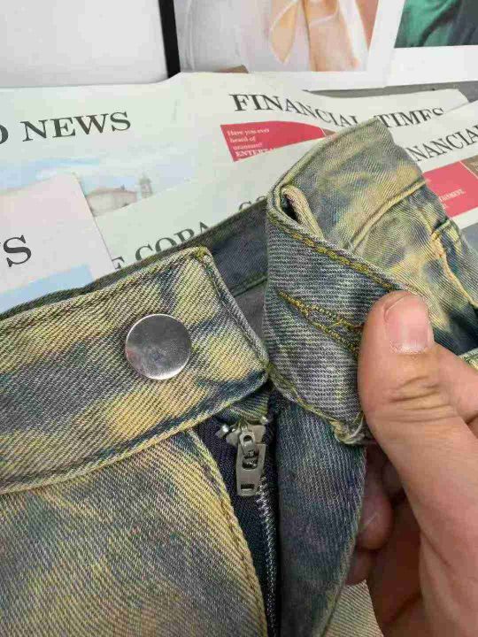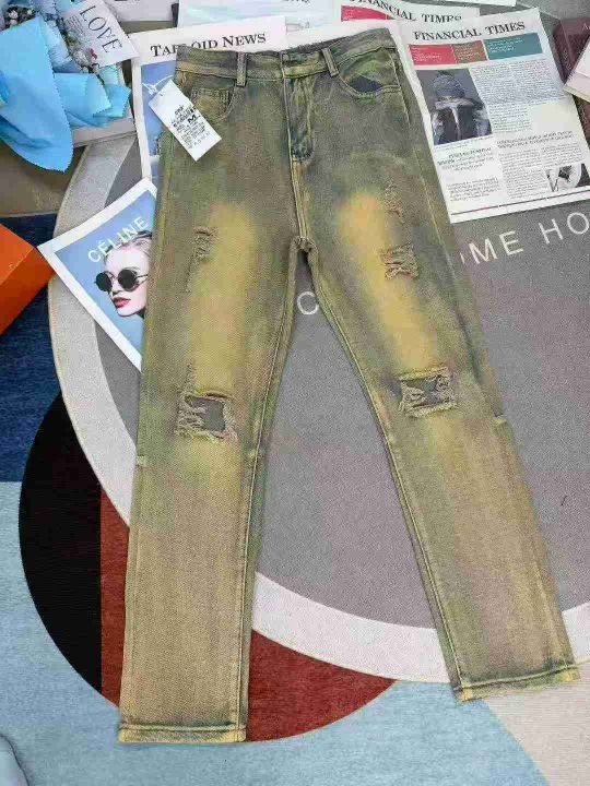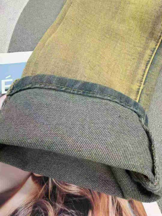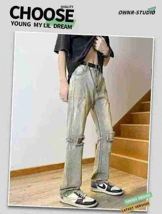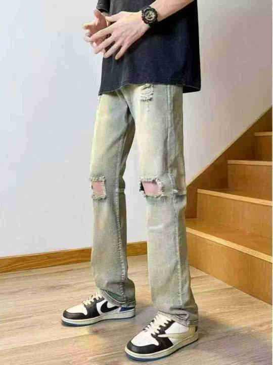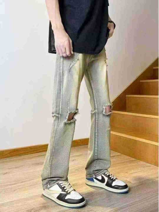 黄泥色破洞男士显瘦水洗做旧百搭高街潮牌牛仔裤,单款...