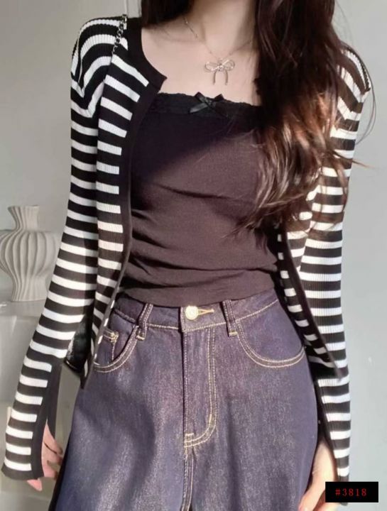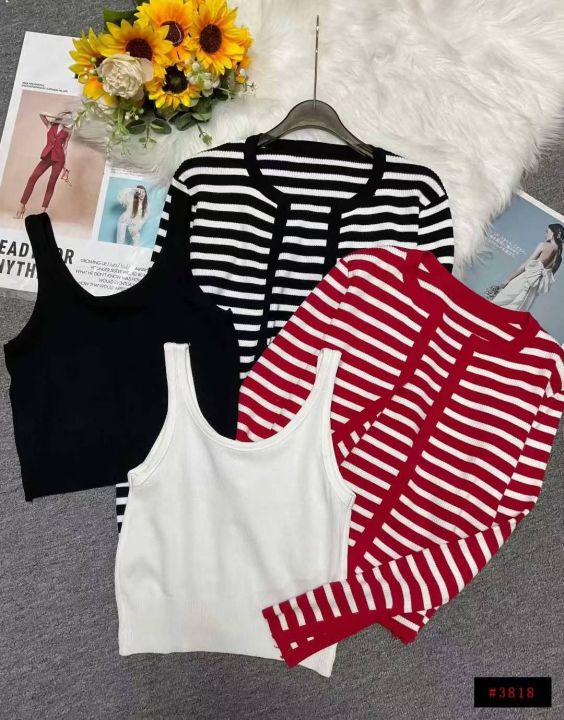 秋季新品撞色条纹包芯纱针织毛衣开衫+针织吊带背心2件...