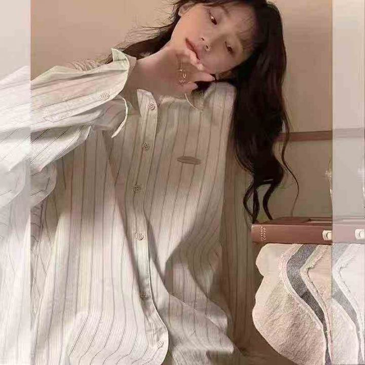 春秋新款叠穿大码宽松休闲显瘦长袖衬衫女法式衬衣设计感小众条纹上衣 独立...