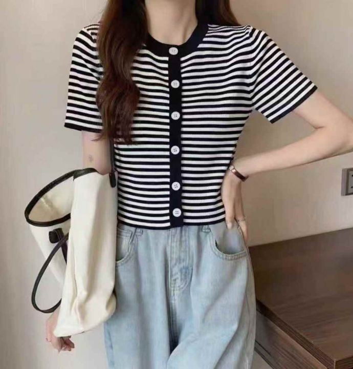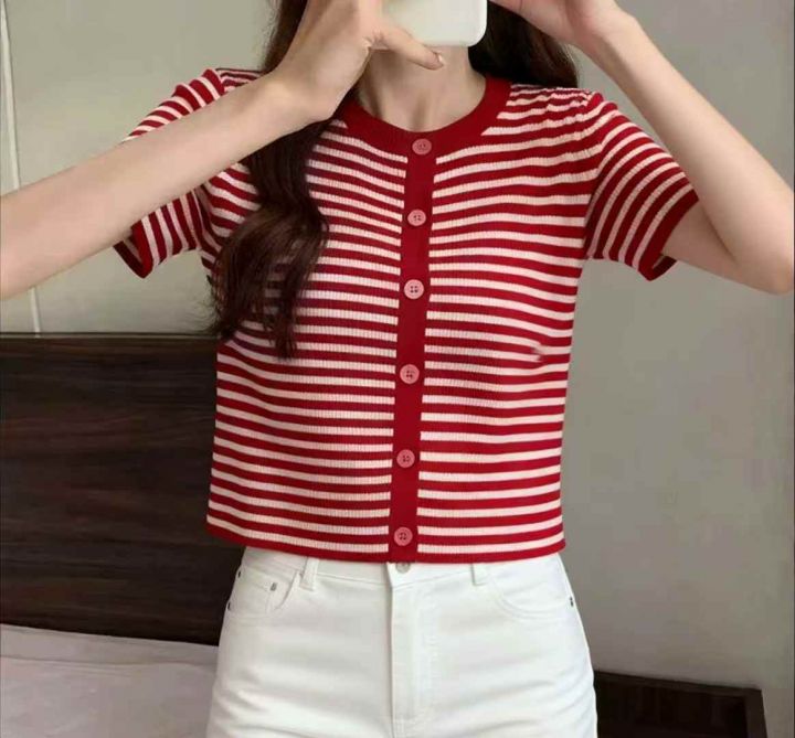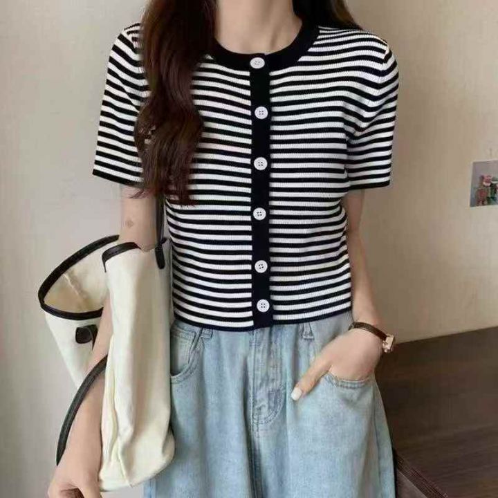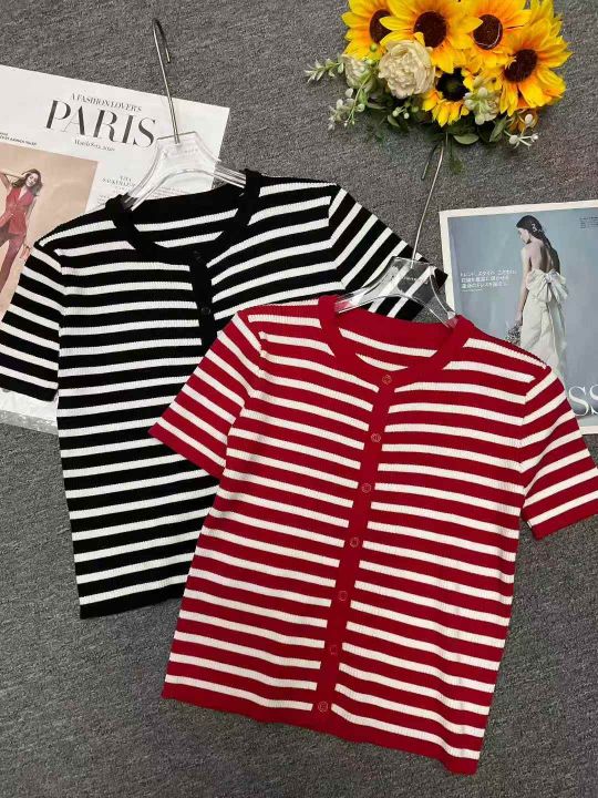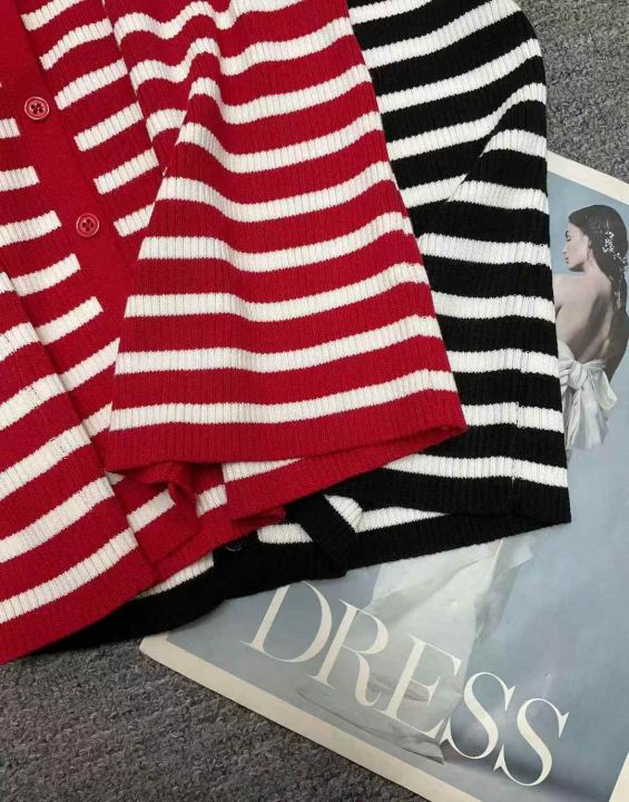 夏季新款撞色条纹冰丝曲珠针织短袖开衫,独立包装,均码面软糯舒适弹力大,140件,全清6.9元超低价秒杀!
