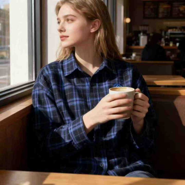美式复古格子女衬衫宽松外套长袖上衣衬衣港风薄款格子...