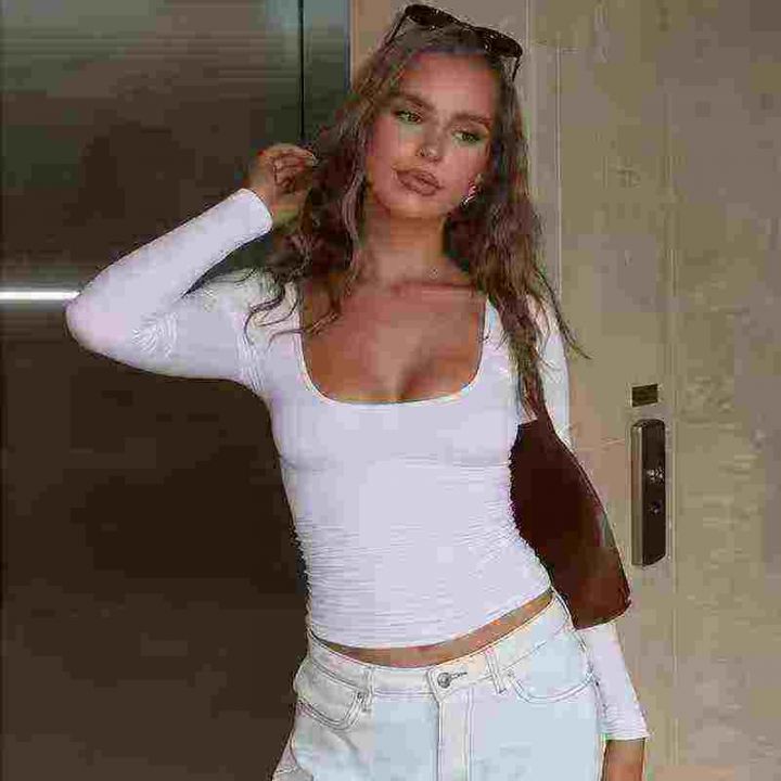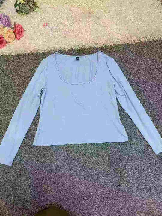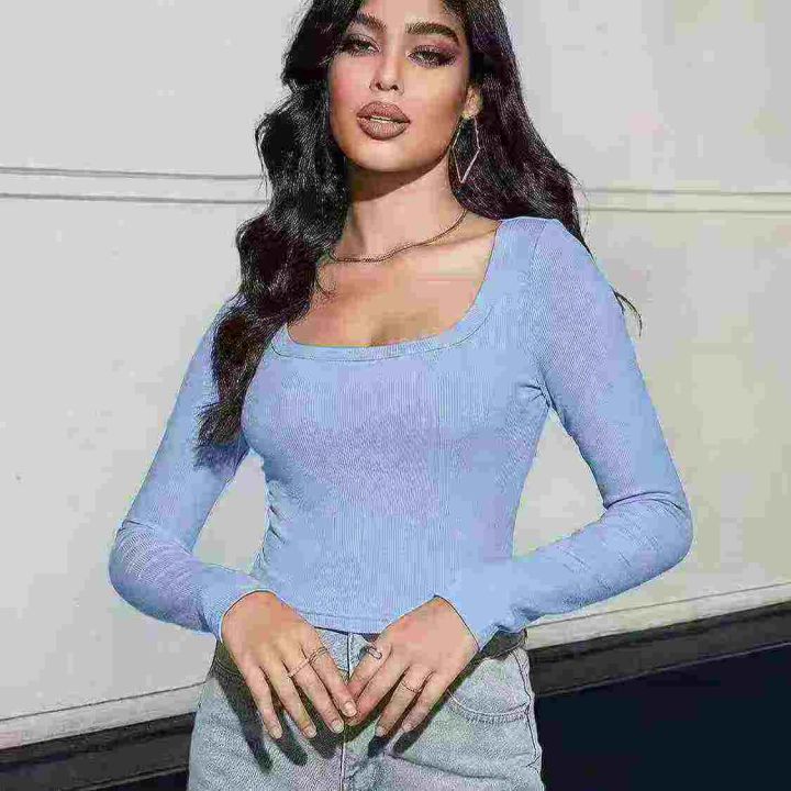 5851件,女早秋季纯色百搭U领长袖T恤上衣女弹力修身高...