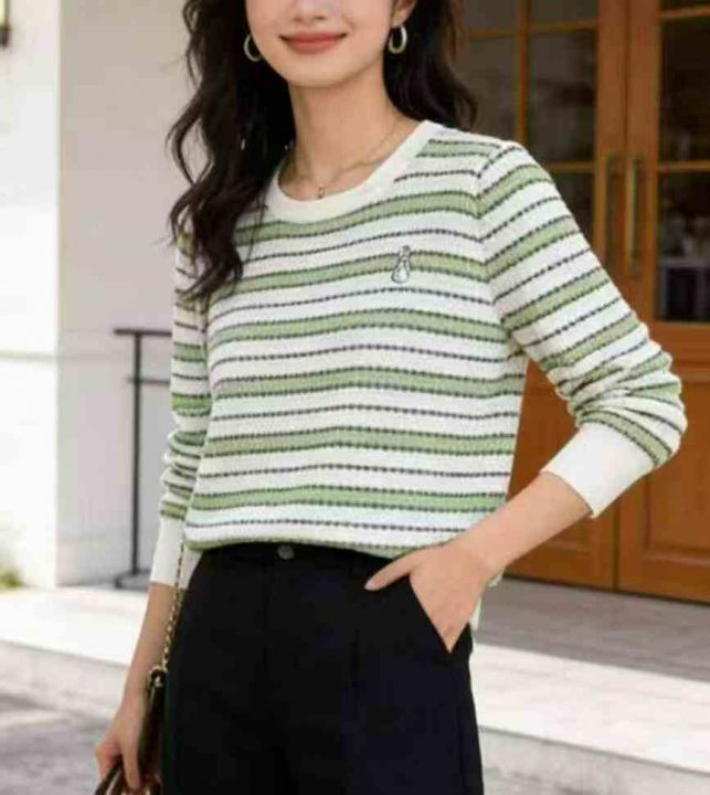 春秋新款刺绣小标韩系撞色条纹宽松百搭针织圆领套头毛衣,独立包装,均码面...