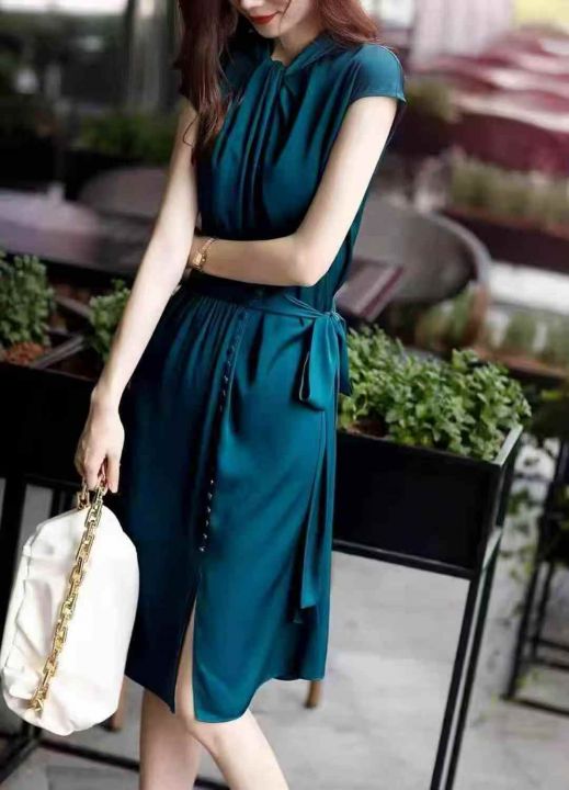 104件真丝 桑蚕丝连衣裙正式场合端庄精致连衣裙女2025新款夏季收腰高级感蓝色显瘦中长裙 蓝色20多件黑色70多件