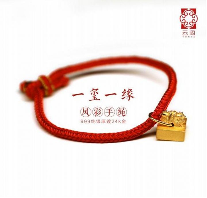 纯手工编织手绳,精工细作,可调节尺寸。红色在中国文 化里代表福禄寿喜。设计师以故宫文物“皇后之宝”为灵 感来源,结合凤凰造型,衍生设计出双凤纽方形玺做为手 绳挂坠配饰,底部刻有篆体 “缘 ”字,取意有凤来仪。 “皇后之宝”在皇帝大婚行册封礼时,用作皇后身份的象 征,代表天命所归,亦是祥瑞之兆。御玺又谐音“遇喜”, 寓意为出门遇喜事,抬头遇贵人,所结皆善缘,所想皆有 成。御玺遇喜,相称相宜,乐乐陶陶,随遇随喜。