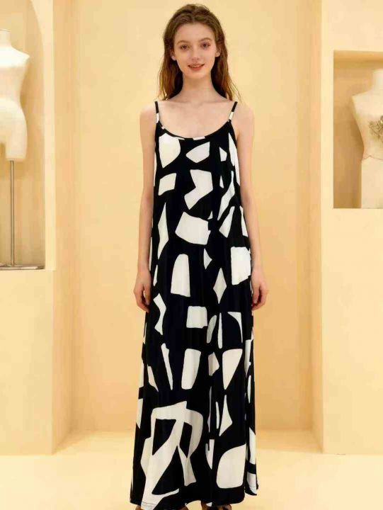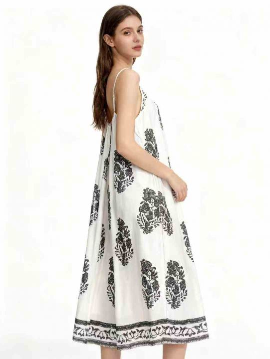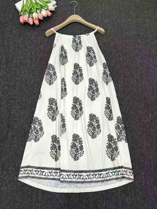 设计感宽松复古印花无袖吊带连衣裙夏季新款海边度假风...
