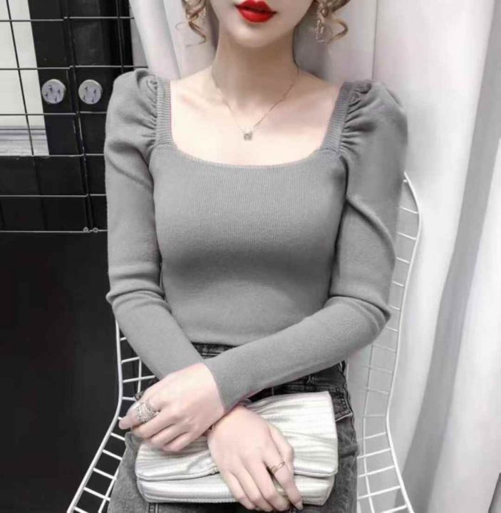 秋冬季新品洋气泡泡袖方领弹力修身气质套头毛衣,独立...