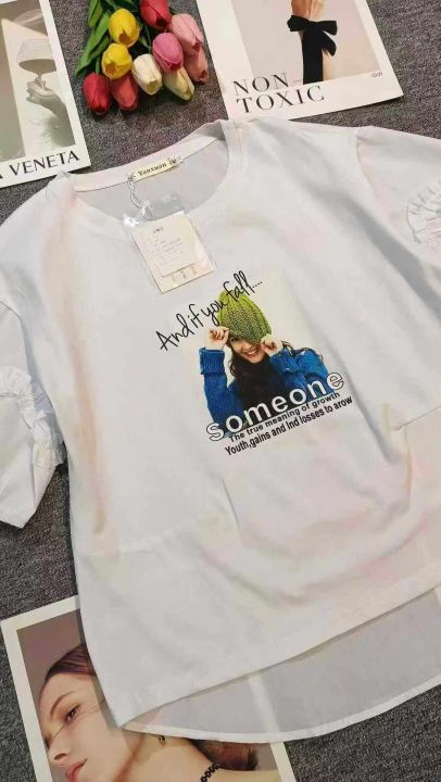 简约通勤设计感印花泡泡袖T恤,[爱心]405件左右,码数L-4XL,穿90-150斤,(轻微染色,黄点,有的没有,)懒得挑了,便宜处理,不介意的来
