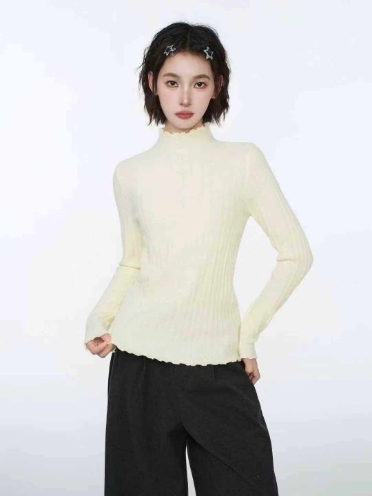 修身百搭半高领木耳边长袖打底衫针织衫,整款两色,手...