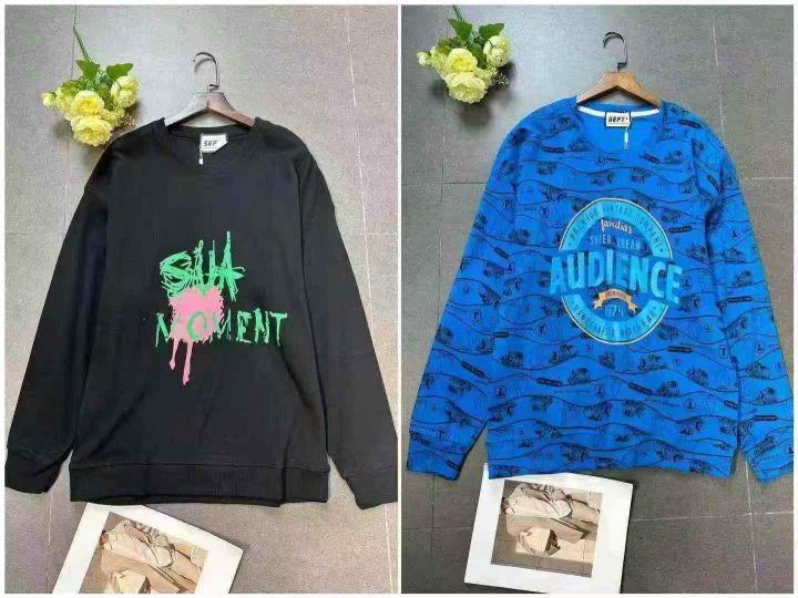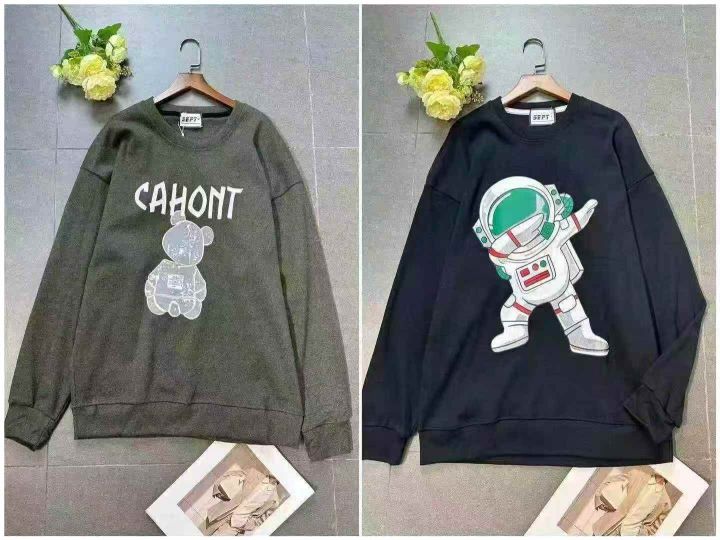 上身圆领卫衣[太阳]全清13.、300件、均码男女纯棉宽松休闲时尚字母图案印花长袖卫衣,大部分后领包边到肩,部分有吊牌,品质,这个性价比直接拉满✅全部全新独立包装、100/200件起多款混配13.3。 货号:1303