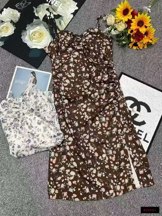 夏季新款复古网红设计款开叉法式浪漫性感吊带雪纺碎花连衣裙,独立包装,码...