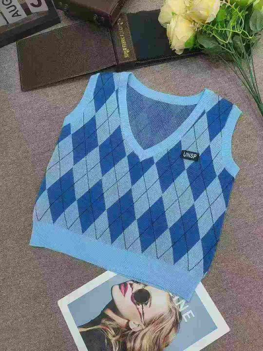 复古蓝色菱形格纹马甲2025春秋新款V领短款针织上衣宽松坎肩外穿潮,550件,清5.5,分➕1