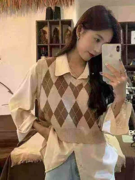 复古咖色菱形格纹马甲女2025春秋新款V领短款针织上衣宽松坎肩外穿潮,独立包装,均码,510件,清5.5,分➕1