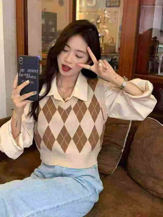 复古咖色菱形格纹马甲女2025春秋新款V领短款针织上衣...
