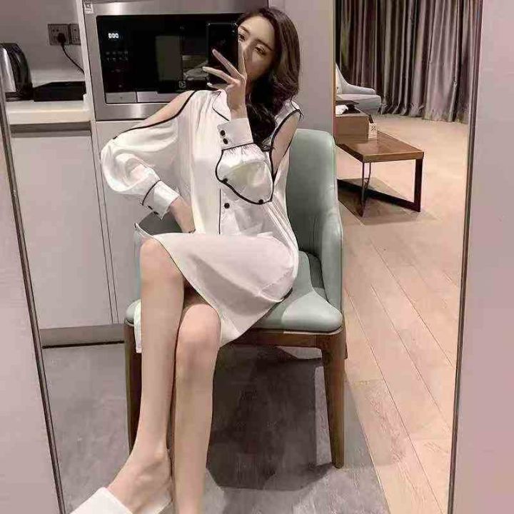 ① 网红冰丝性感露肩韩版宽松家居睡裙!独立包装,整...