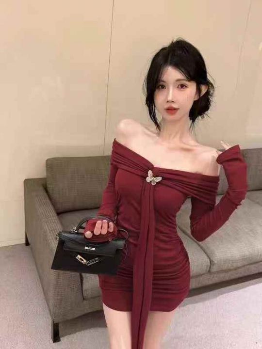 一字肩紫色挂脖长袖连衣裙女春秋冬季性感辣妹紧身收腰包臀短裙子 独立包装 ...