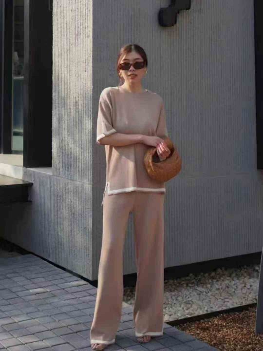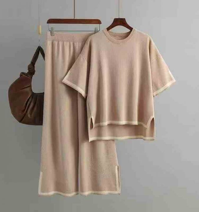 夏季复古慵懒风撞色宽松百搭针织上衣高腰显瘦长裤两件...