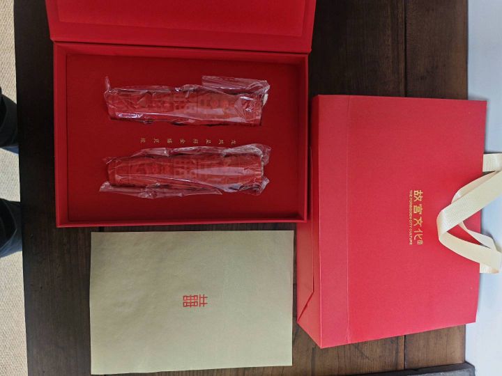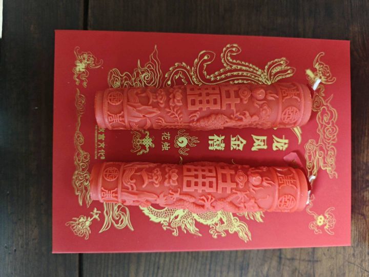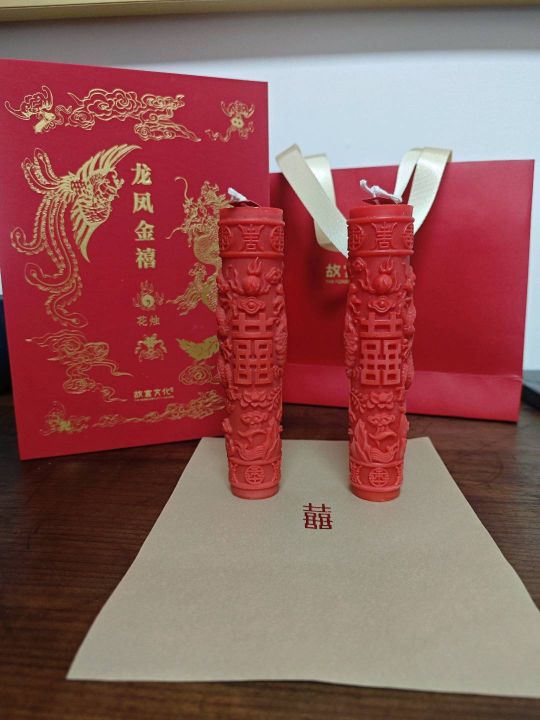 木产品以故官博物院藏“紫红色龙凤纹喜字圆蜡”为设 计灵感。设计师取文物的外形、纹样等元素重新描绘, 手工雕塑塑型、制模,手工灌注而成。产品设计为大红 色,模拟文物原型,颜色艳丽,造型美观,并由调香师 手工调香,使产品香气清新高雅,增添喜气氛围。一套 两支组成礼盒,以喻吉祥喜庆、夫妻和美,可做洞房花 烛,也可作为日常家庭装饰,增添龙凤呈祥的气氛。送 礼自用皆为佳选。