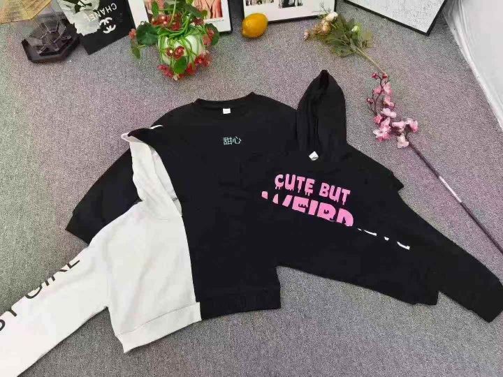 童装女童小辣妹短款卫衣,数量300件左右,尺码110--160,带帽跟圆领占比差不多,三个款,独立包装,大货干净整齐。 货号:1303