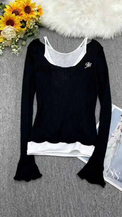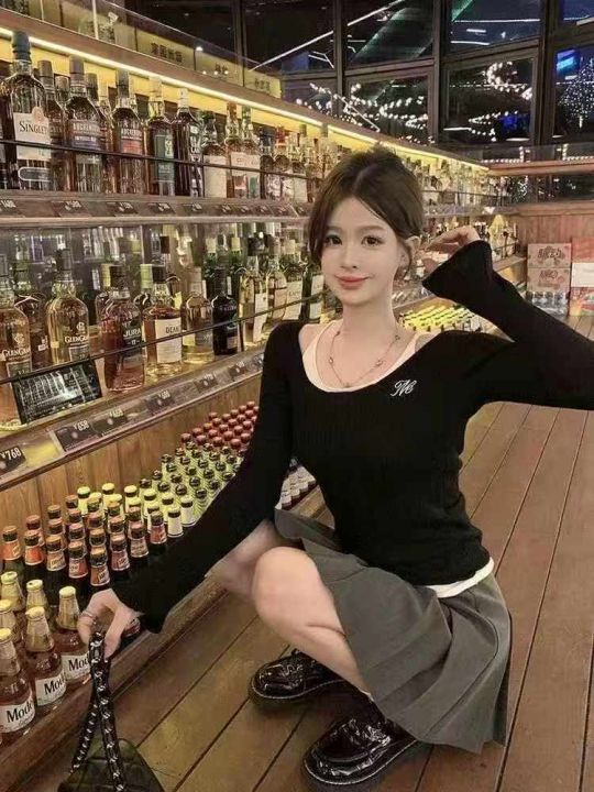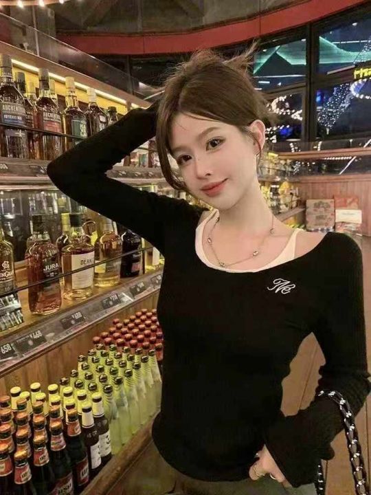 秋季新款假两件U领小众弹力修身显瘦刺绣长袖针织衫,独立包装,均码面料软糯舒适弹力大,469件,全清6.9元超低价秒杀!分货加一!